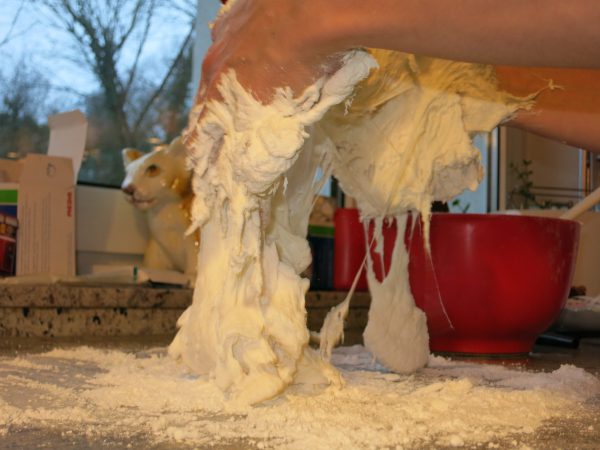 - Wenn du das Gefühl hast, mit dem Rührlöffel nicht mehr vorwärts zu kommen, den Fondant auf einer sauberen Arbeitsfläche unter Hinzunahme von weiterem Puderzucker fest kneten, bis es nicht mehr klebt und eine feste Masse ergibt. Ebenfalls eine sehr klebrige Angelegenheit und durchaus schweißtreibend. Aber es lohnt sich, weil der Fondant viel besser schmeckt als gekaufter! (Ich kann die Verarbeitung des Fondants auf einer Ausrollmatte aus Silikon